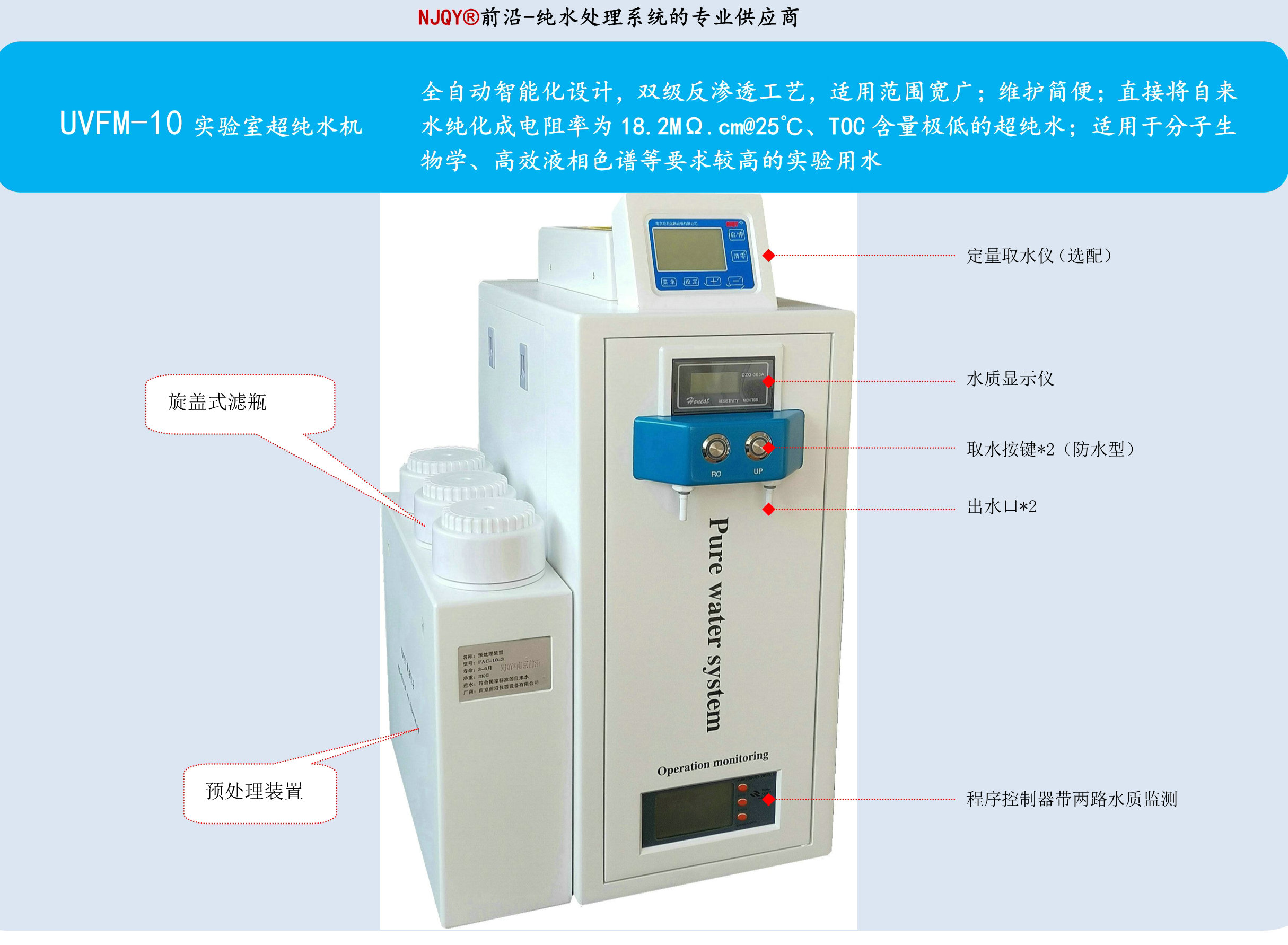 UVFM-10超純水機智能化設計,輕便小巧,臺上式安裝;產水量小,適合用水量不大的用戶;操作簡單,全面適時的運行狀態監控;兩個取水口,分質供水,滿足不同水質需求;出水水質為18.2MΩ的低有機物含量超純水;超過GB6682-2008一級水標準;主要用于生命科學研究、分子生物實驗、總有機碳分析等要求嚴格的試驗用水;管路和壓力部件采用旋蓋式特殊設計,進出水口均位于濾瓶底部,可直接在設備頂部更換耗材,不需拆開機箱;雙級反滲透設計,適用范圍寬廣